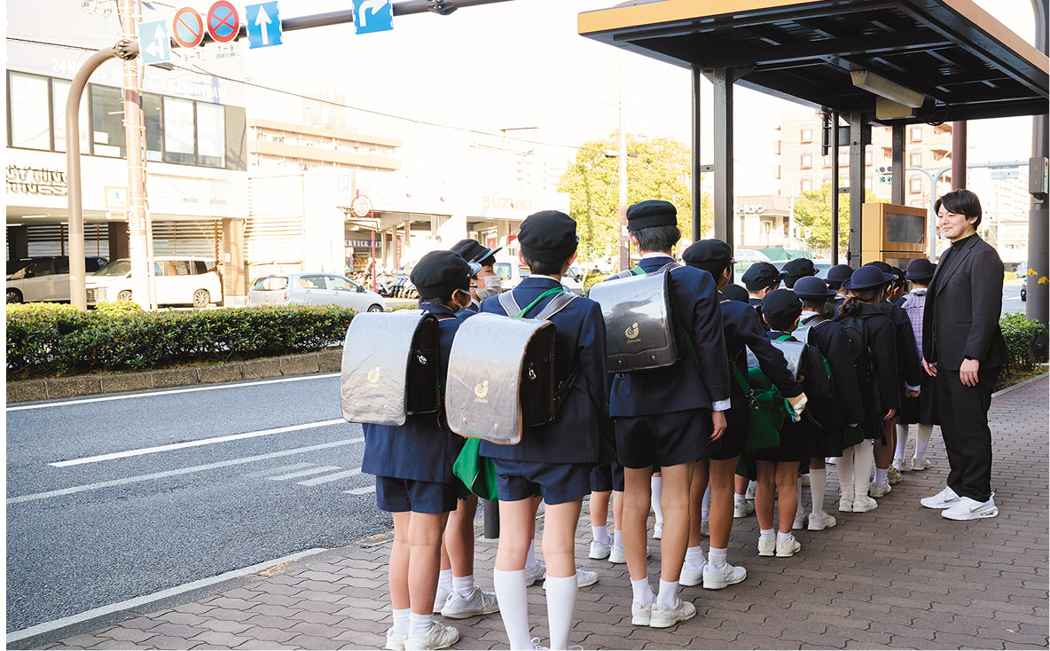 校門には警備員が常駐するとともに、防犯カメラも設置。登下校時以外は全ての門を閉め、警備員が来校者をェック。教員も定期的に校内を巡回し、子どもたちの安全を守ります。また、登下校の際は、教員と警備員が周辺を監視しながら、子どもたちの見守りを行います。下校時、最寄りのバス停にも教員が立ち、低学年児童には近鉄の駅まで引率します。