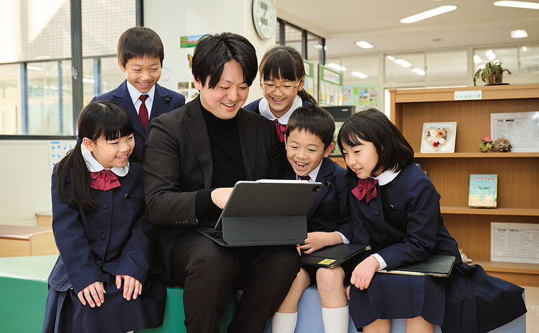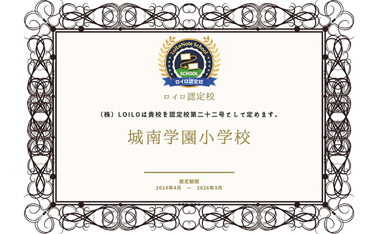 授業支援システム「ロイロノート・スクール」を導入し、学習を進めています。これは、思考力やプレゼンテーション力の育成を目的としたアプリで、自分の考えをテキストや画像、動画などで可視化・共有し、思考の過程を記録しながら、学習内容を整理・体系化することができます。また、本校は子ども主体の学びに取り組む学校として、2024 年に大阪の小学校で初めて「ロイロ認定校」に選出されました。さらに、全教員が「ロイロ認定ティーチャー」にも選出されており、学校全体でロイロノートを活用した先進的な授業づくりに取り組んでいます。