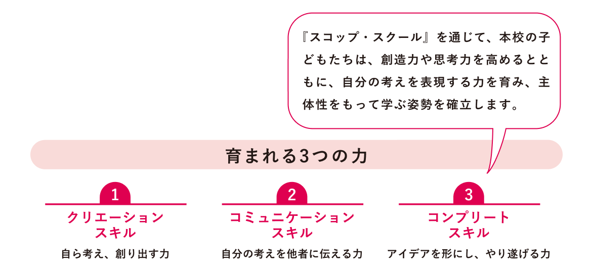 子どもたちの創造力を引き出す探究学習『スコップ・スクール』を導入。自ら考え、創り出すことを目的としたこのプログラムでは、学年ごとに異なるテーマを設定し、専門分野のプロフェッショナル(ナビゲーター)とともに学びを深めます。