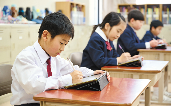 タブレットパソコンに子どもたちが打ち込んだ考えを電子黒板に映し出し、話し合いの中で、分類したりまとめたりしながら、子どもたちの思考力を深めていきます。これからもタブレットパソコンの活用について研究を進め、子どもたちの学力の向上に結びつけていきます。