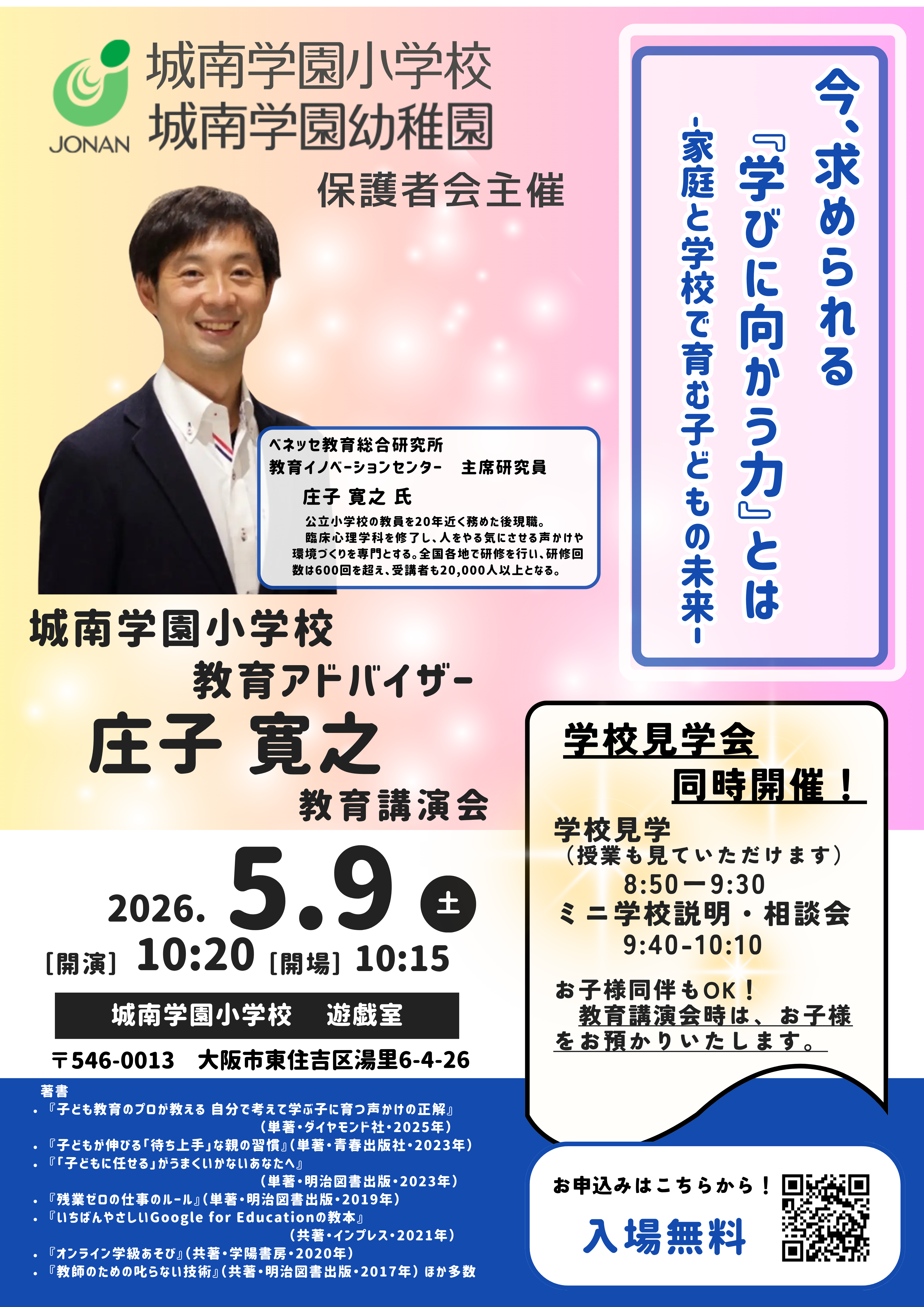城南学園小学校では、教育アドバイザーである庄子寛之先生をお招きし、保護者の皆さまを対象とした教育講演会を開催いたします。