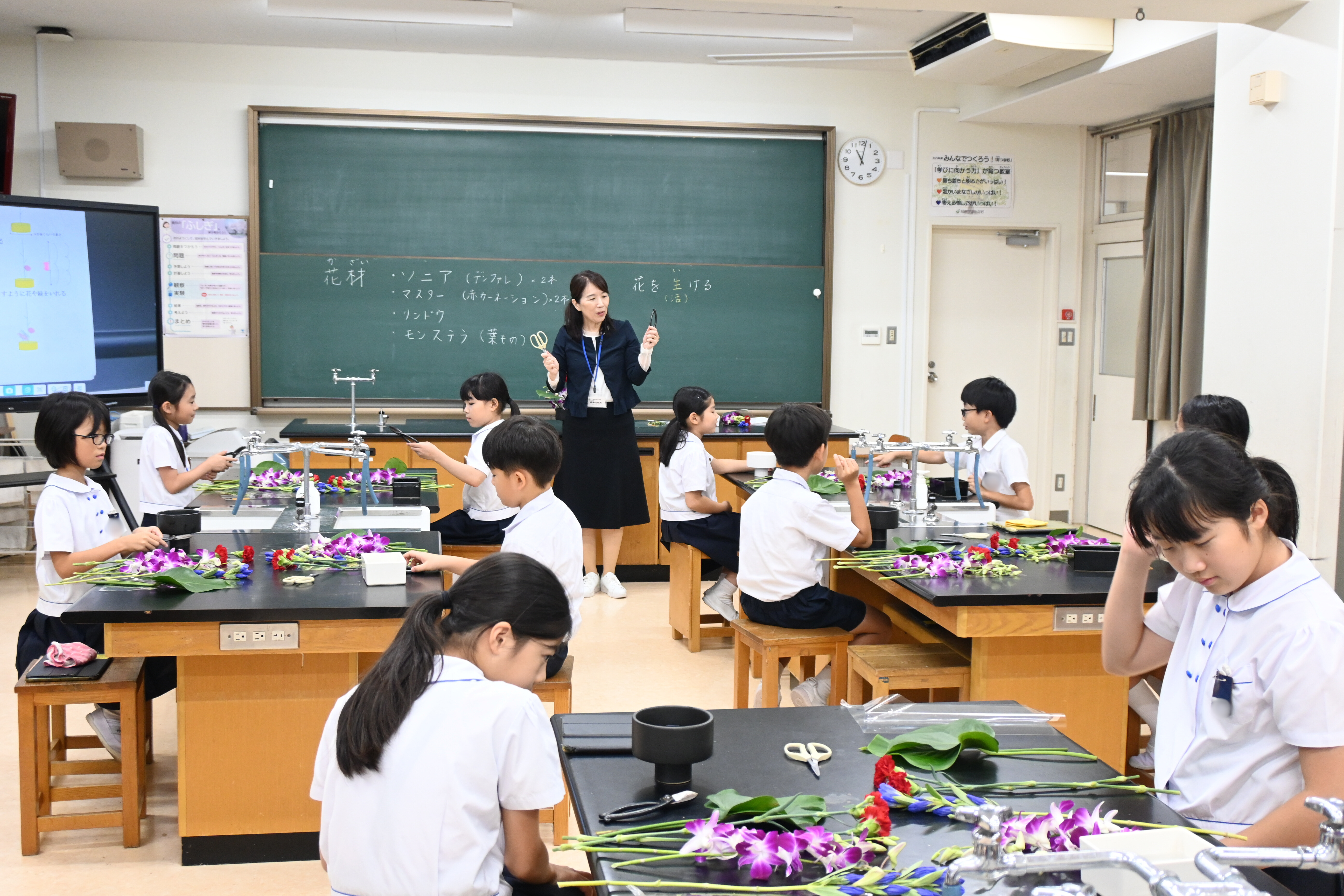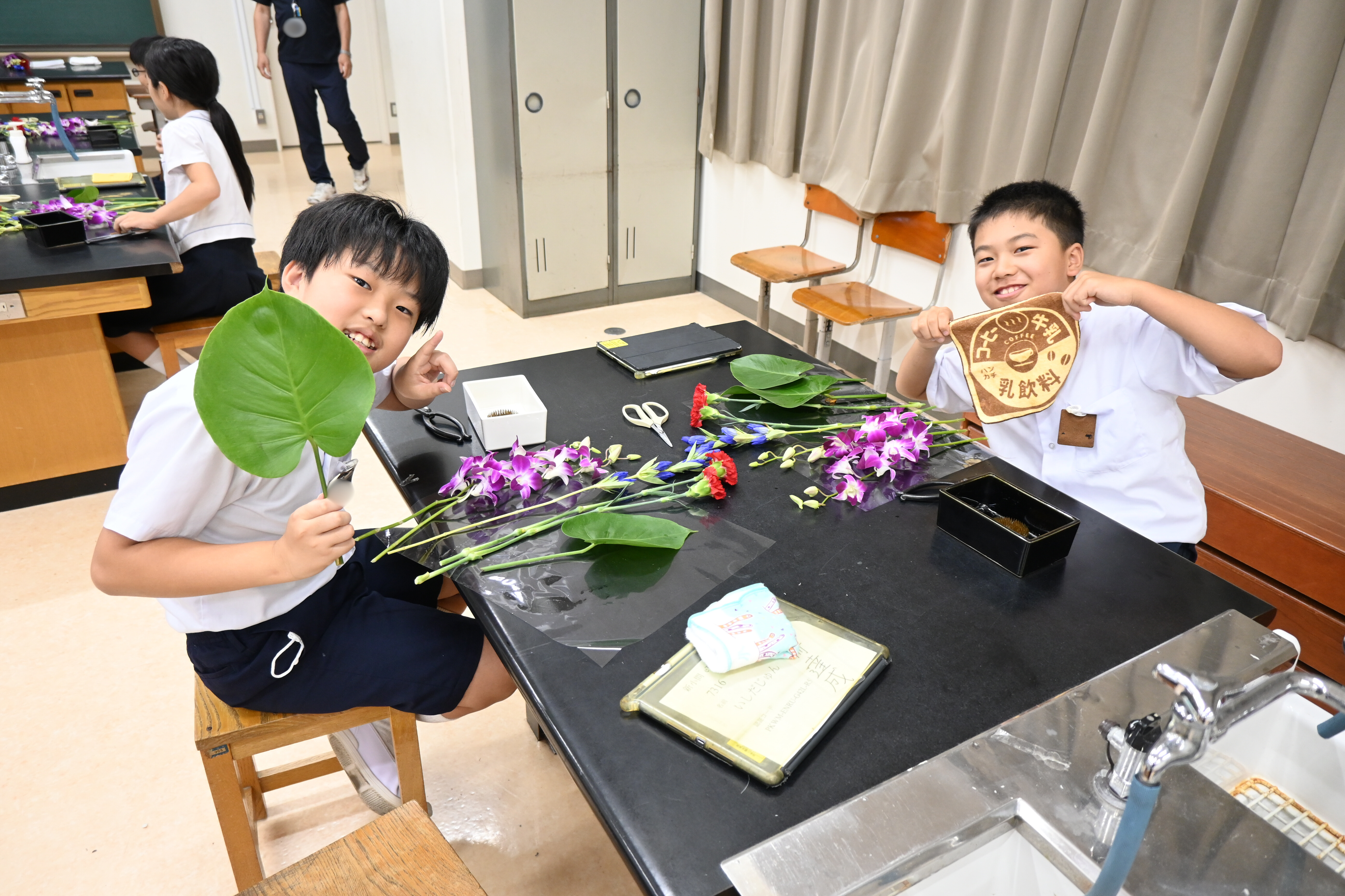ソニア、マスター、リンドウ、モンステラの4つの花材を用い、それぞれが思い思いに花を生けました。作品完成後は自分の作品をiPadで撮影し、満足気な児童たちでした。