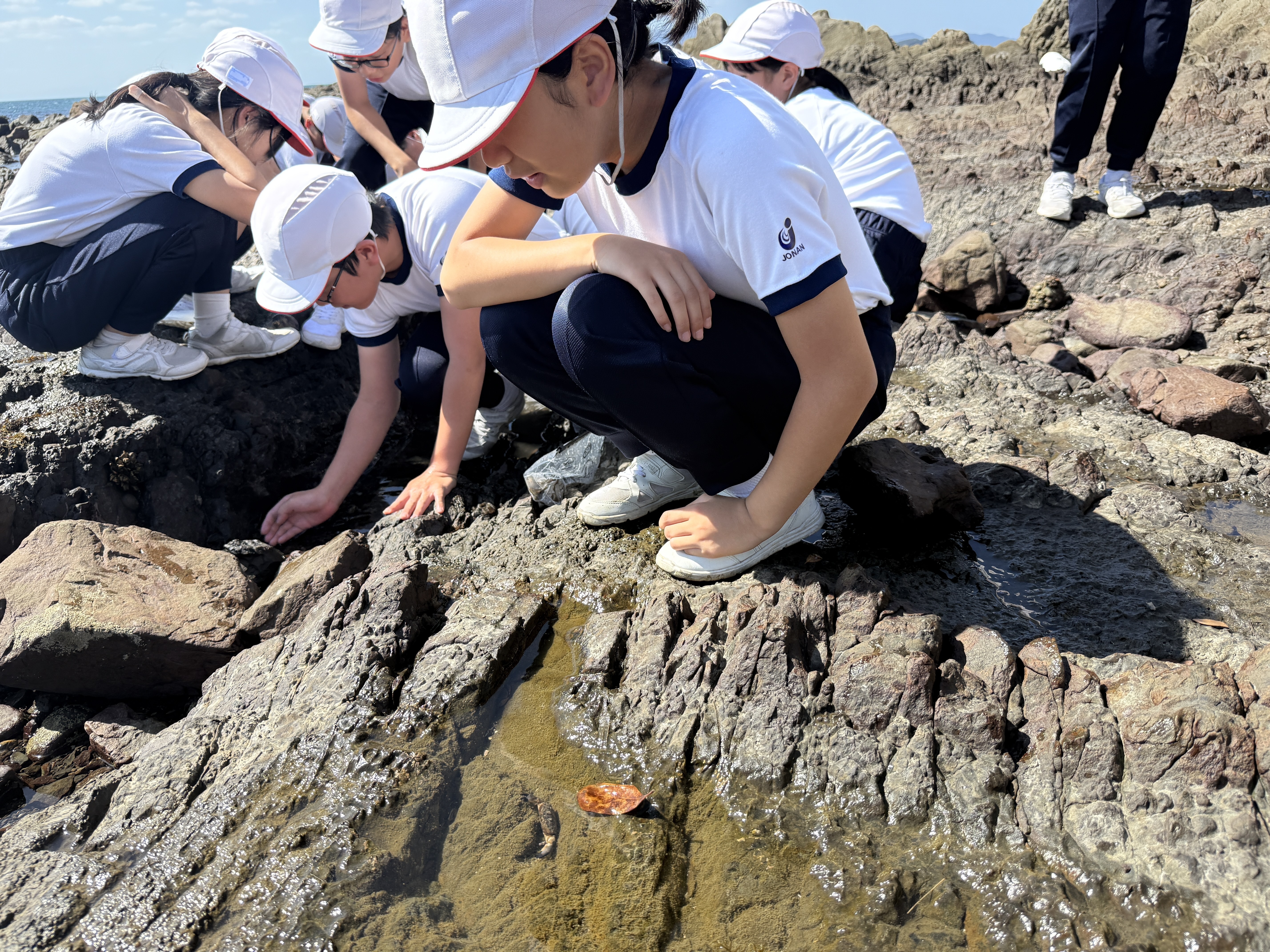 6年生が、和歌山市加太の城ヶ崎海岸へ地層の勉強に行ってきました。現地で地層を観察したり、課題について考えたりしました。「岩石の種類」「整合・不整合」「波と丸い石の関係」「断層」などについて学習しました。
