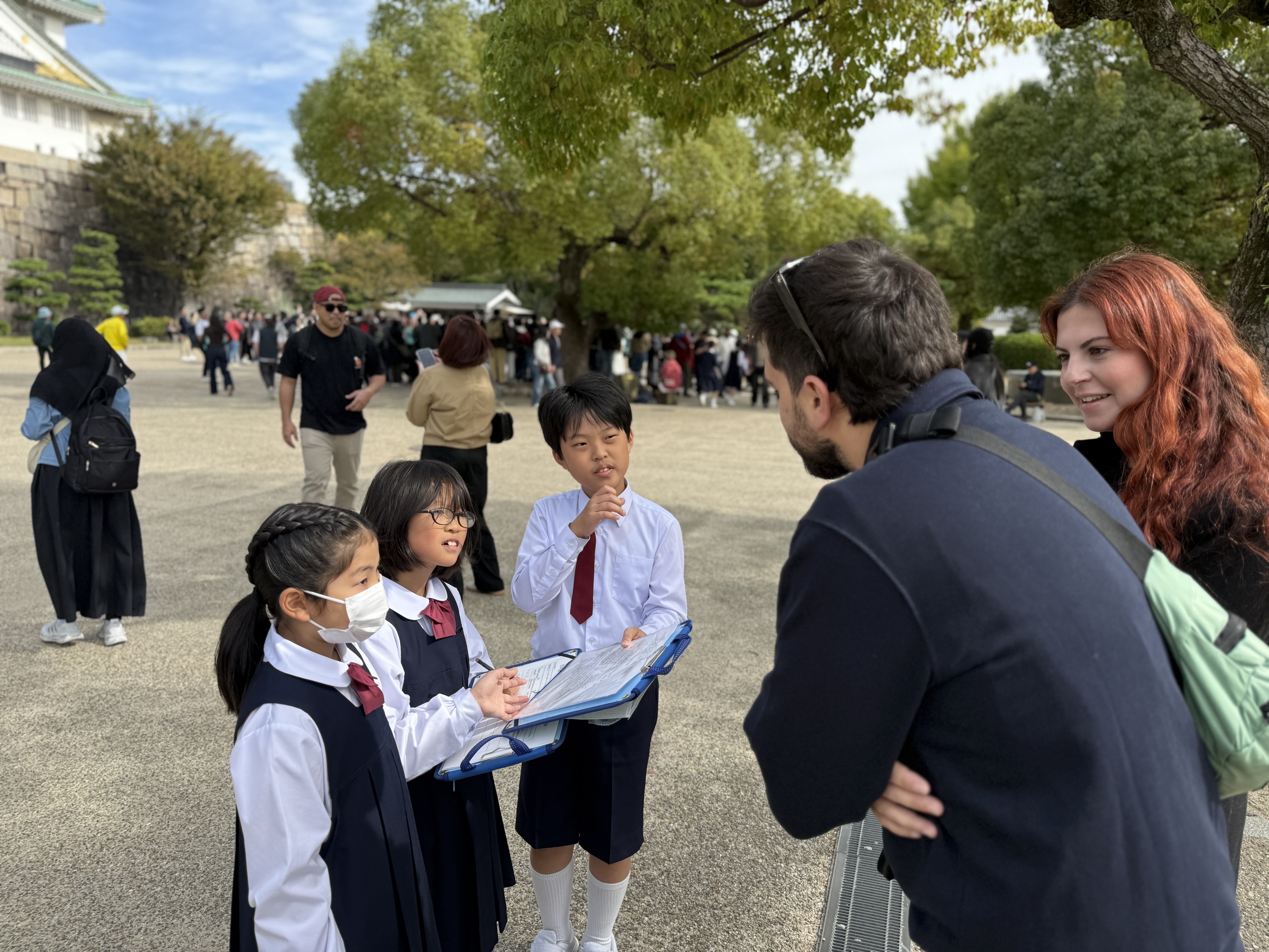 「Hello.」「We are from Jonan elementary school.」「Can we ask you some question and talk about Osaka?」