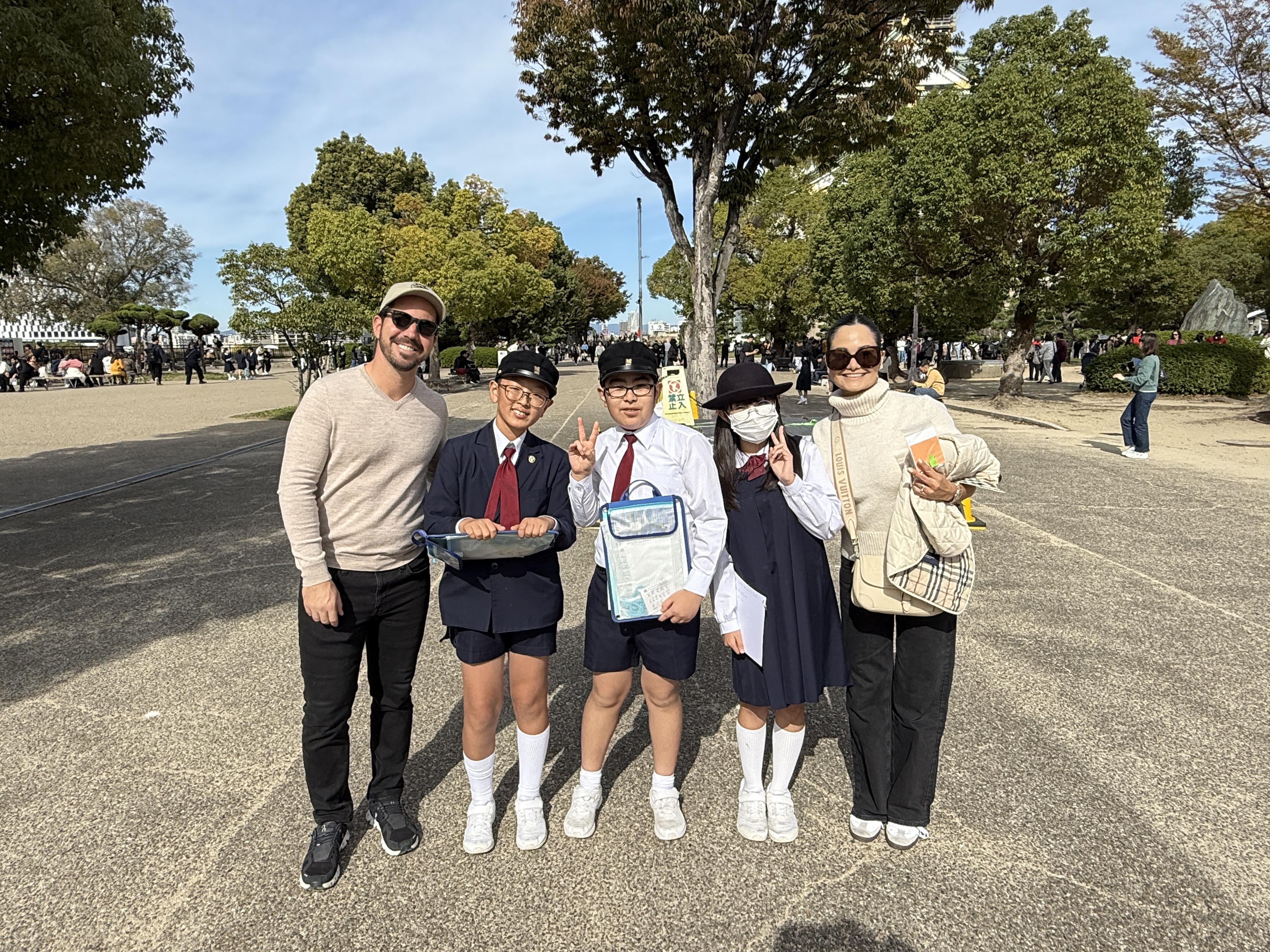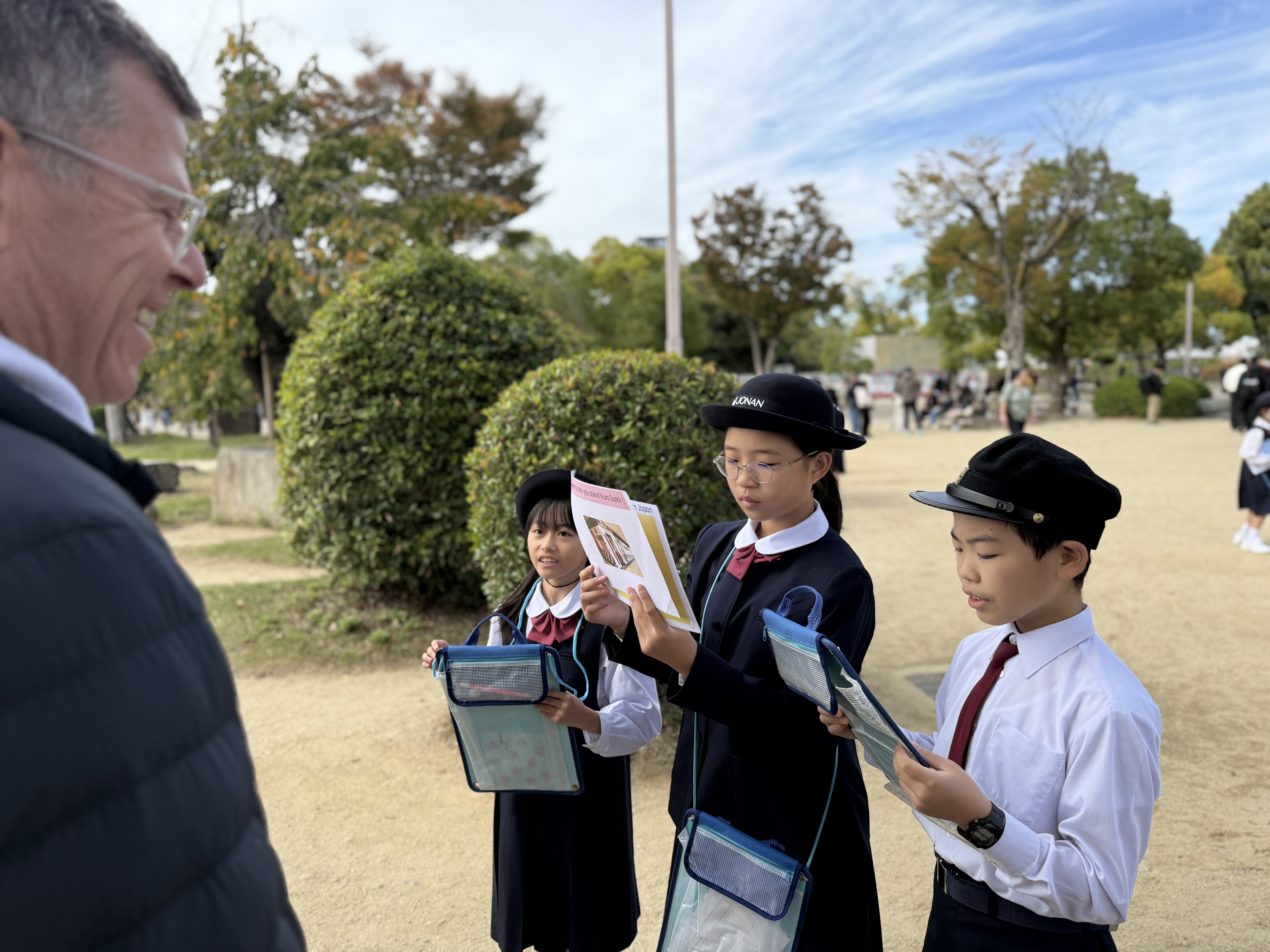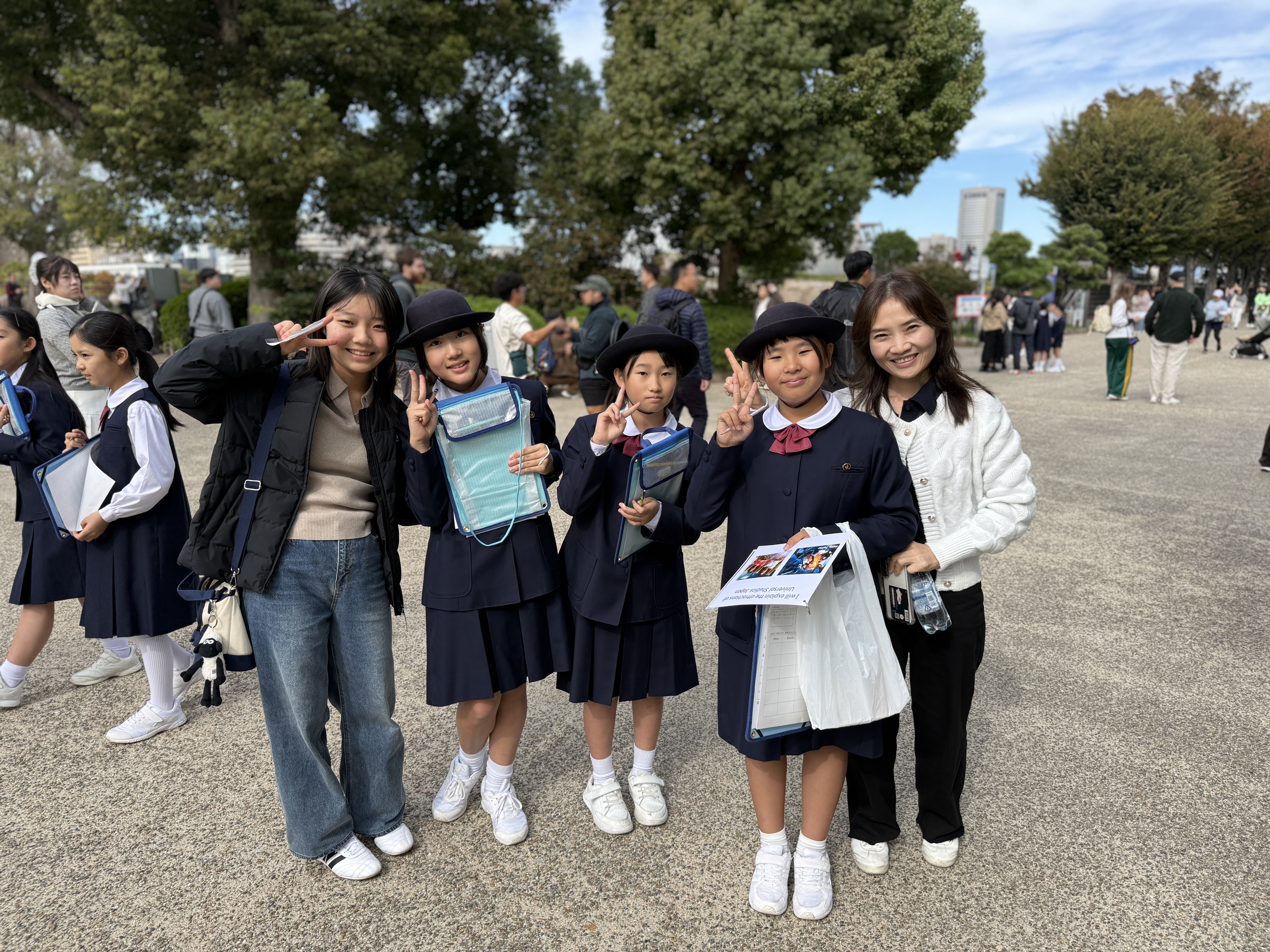 会話の終わりには、折り方の説明を付けた「千代紙の折り鶴」を手渡しました。どの方も喜んでくださり、子どもたちも嬉しそうでした。大阪城公園で、英語の学習に一生懸命取り組むことのできた1日となりました。