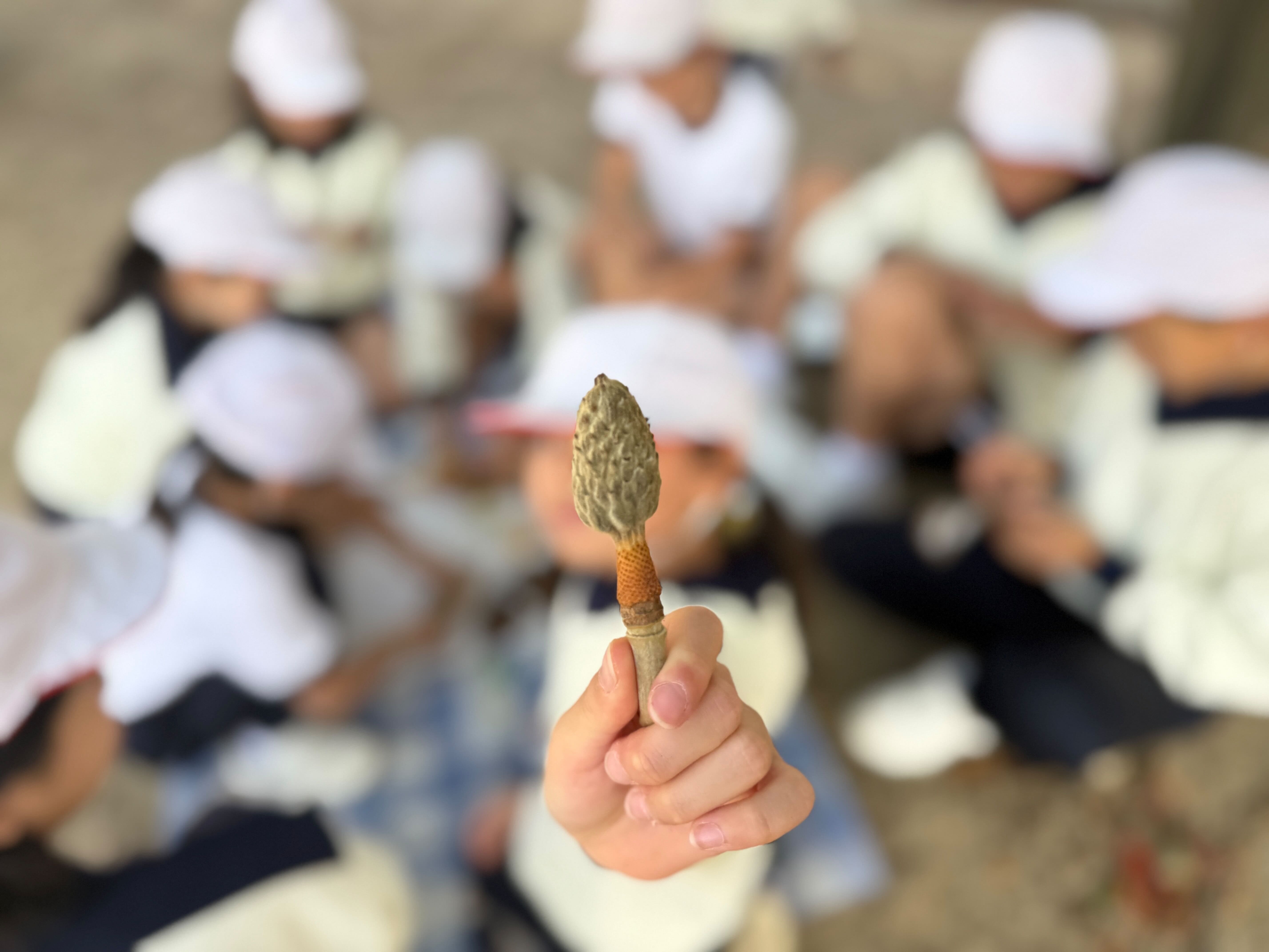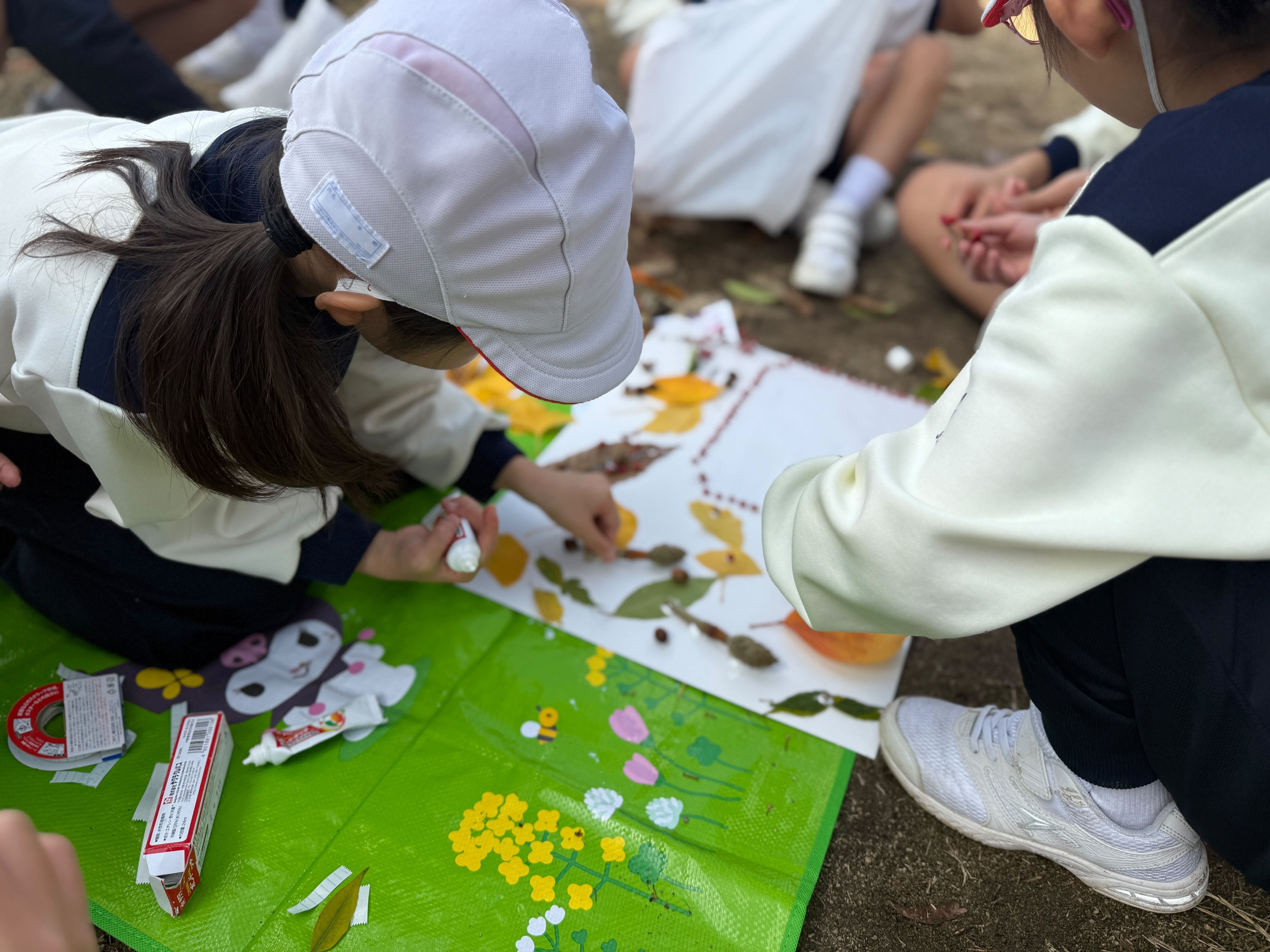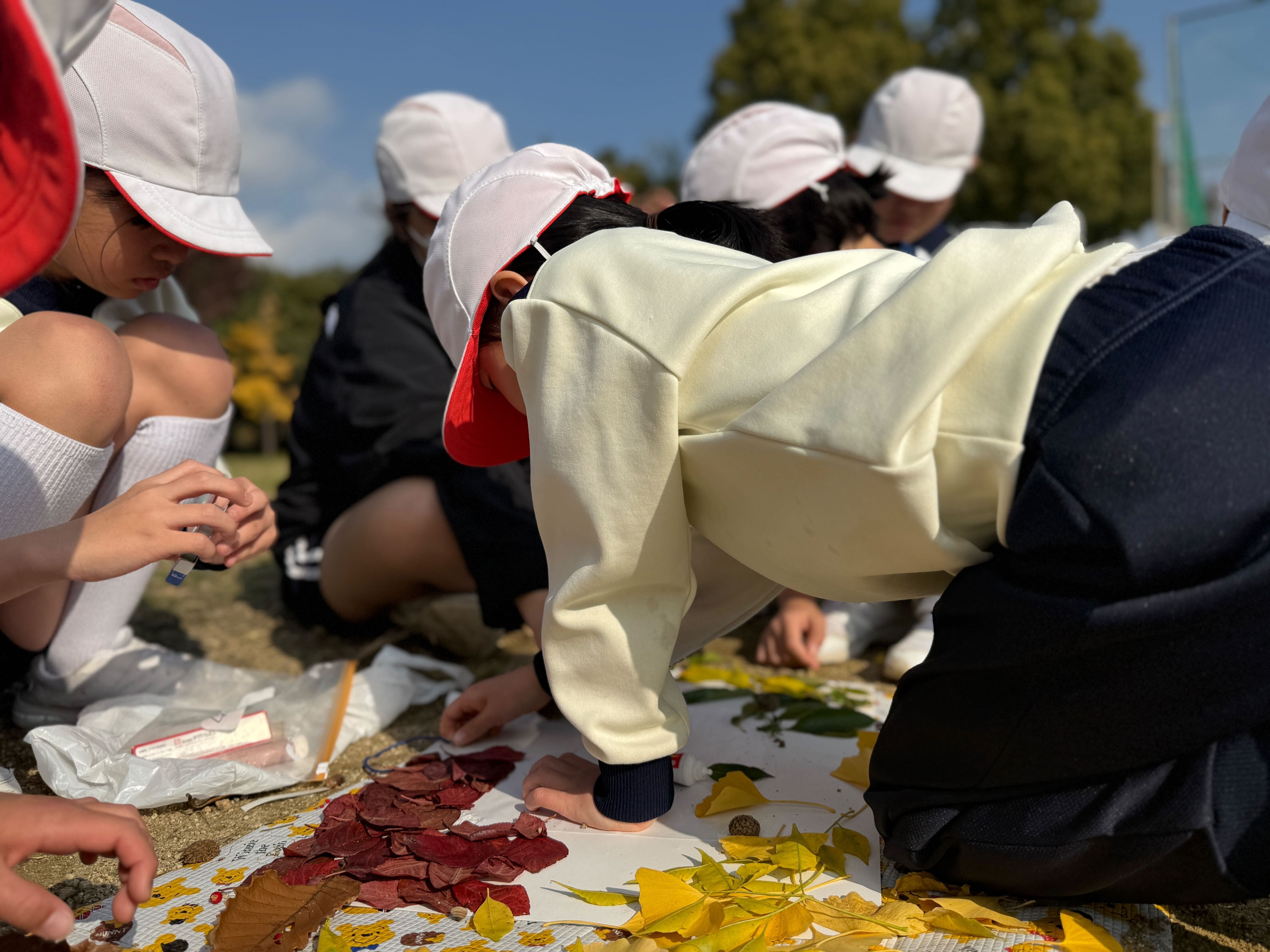 植物園を出た後は「自然deアート(拾ってきた落ち葉で「額縁」を作る。)」に取り組みました。6年生がリーダーとなって、班で一生懸命に取り組んでいました。