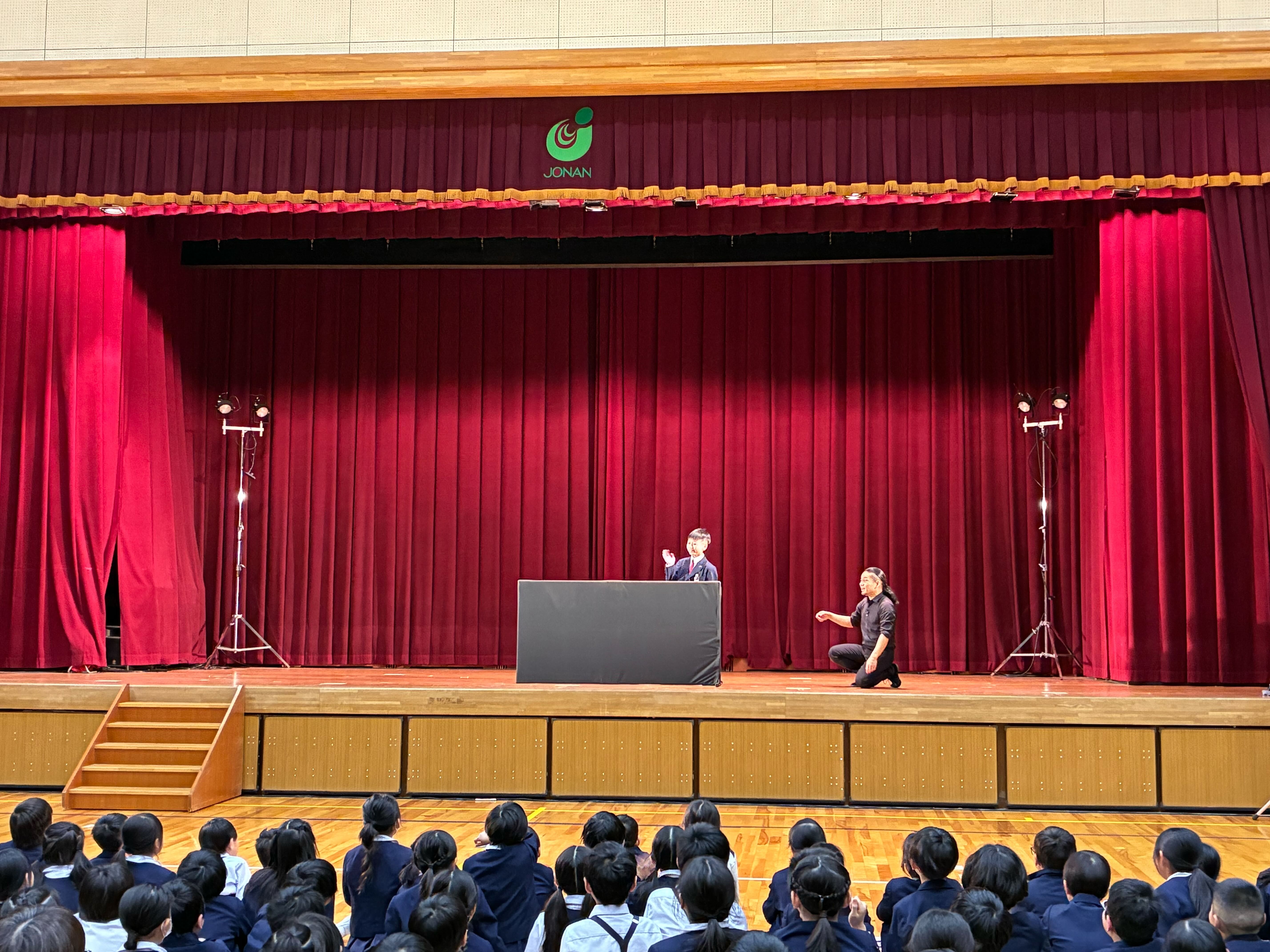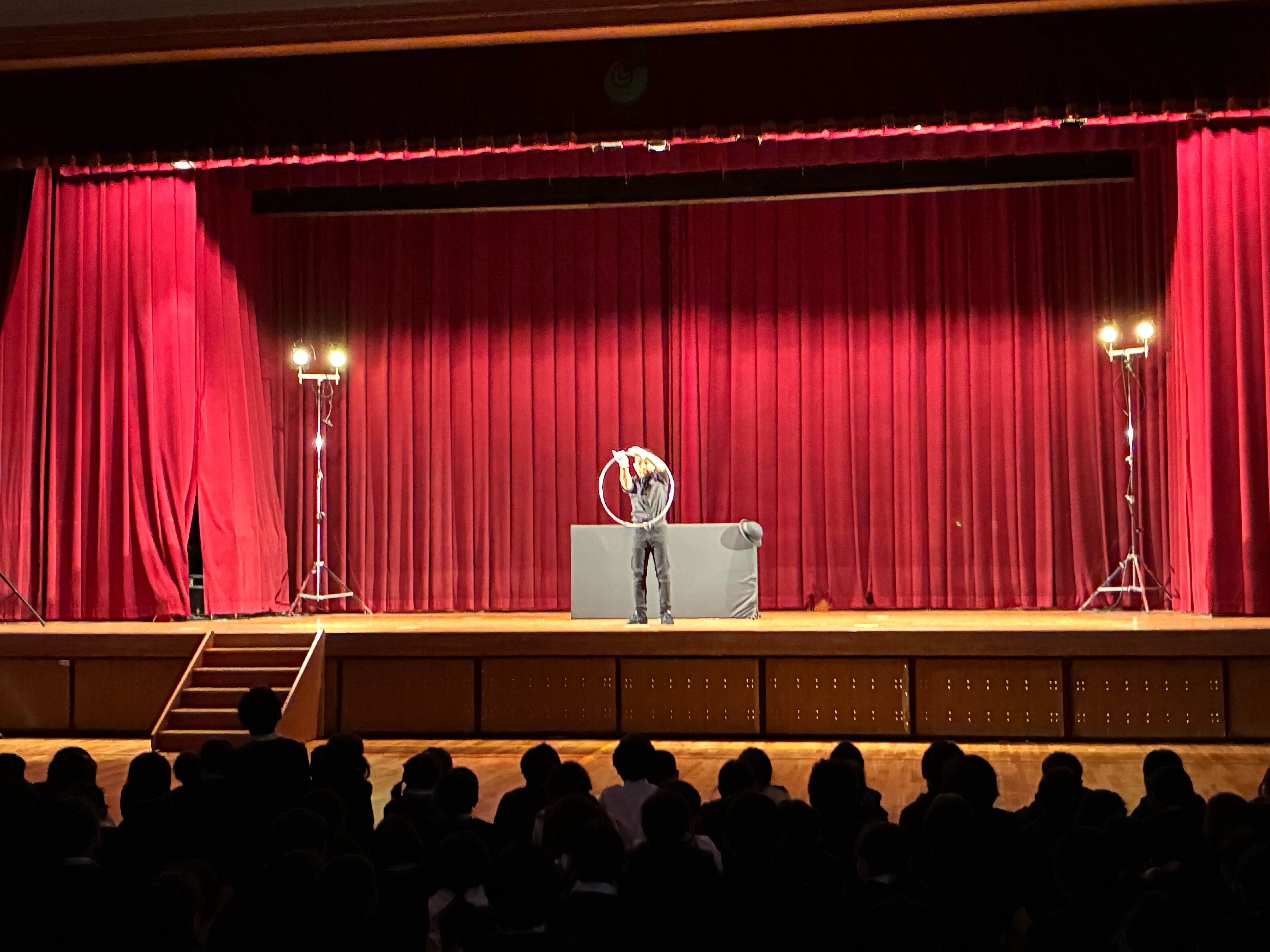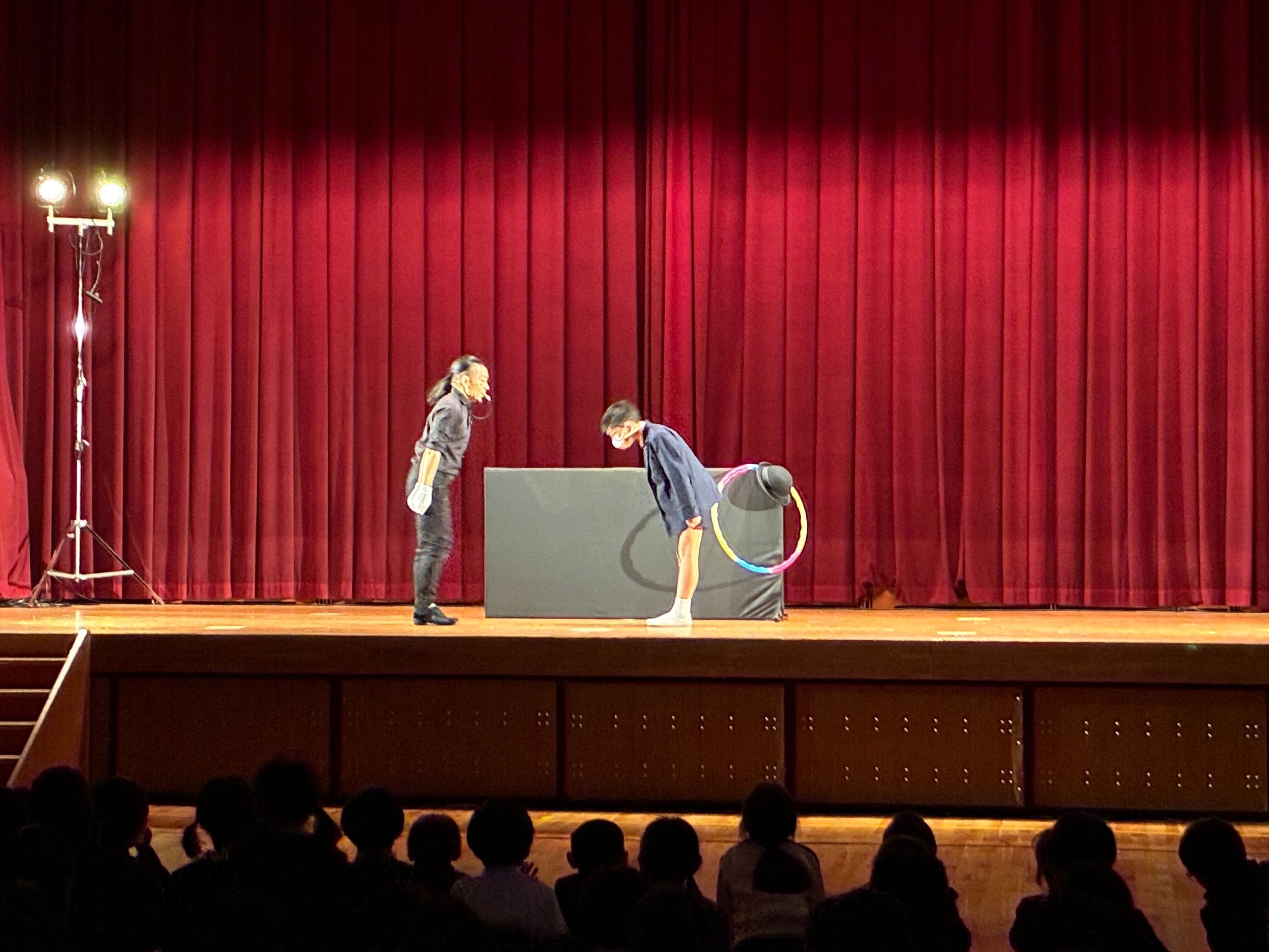 パントマイムといえば、透明な壁に閉じ込められている場面のイメージがありますが、今回はエスカレーターや階段をはじめ、色々なバリエーションを見せてくださいました。「どうやっているのだろう?」と不思議そうな顔をしながら、楽しむ子どもたちの表情が見えました。