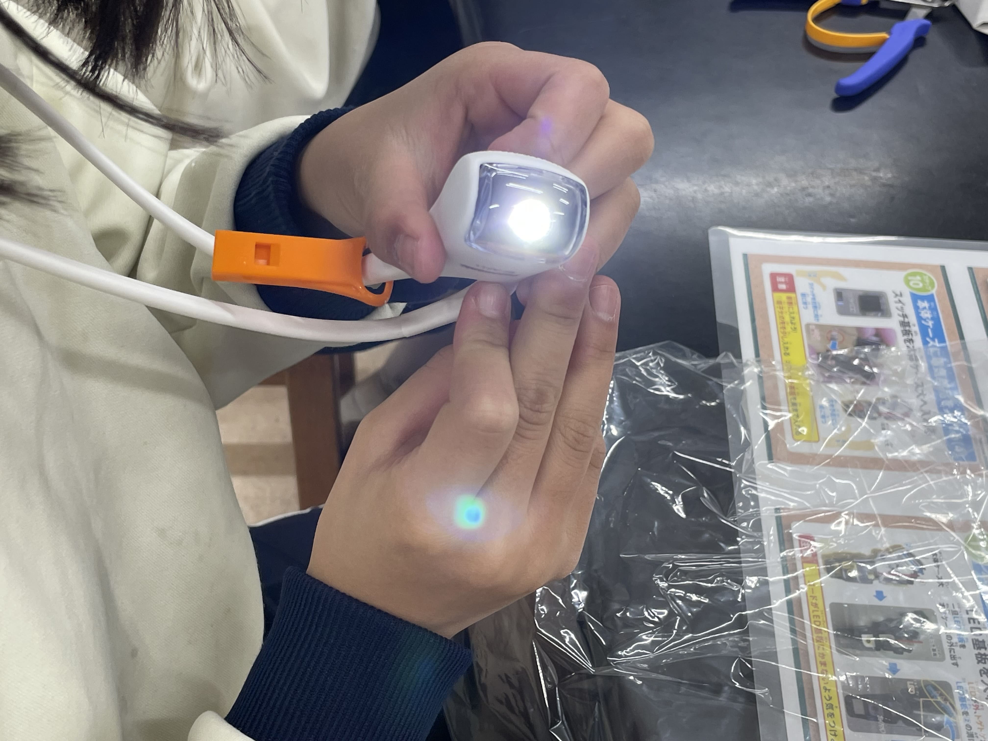 LEDについての説明をはじめとし、ネックライトの作り方を教えていただきました。細かい作業が多く、部品も小さいので、なかなか難しかったですが、全員が完成しました。