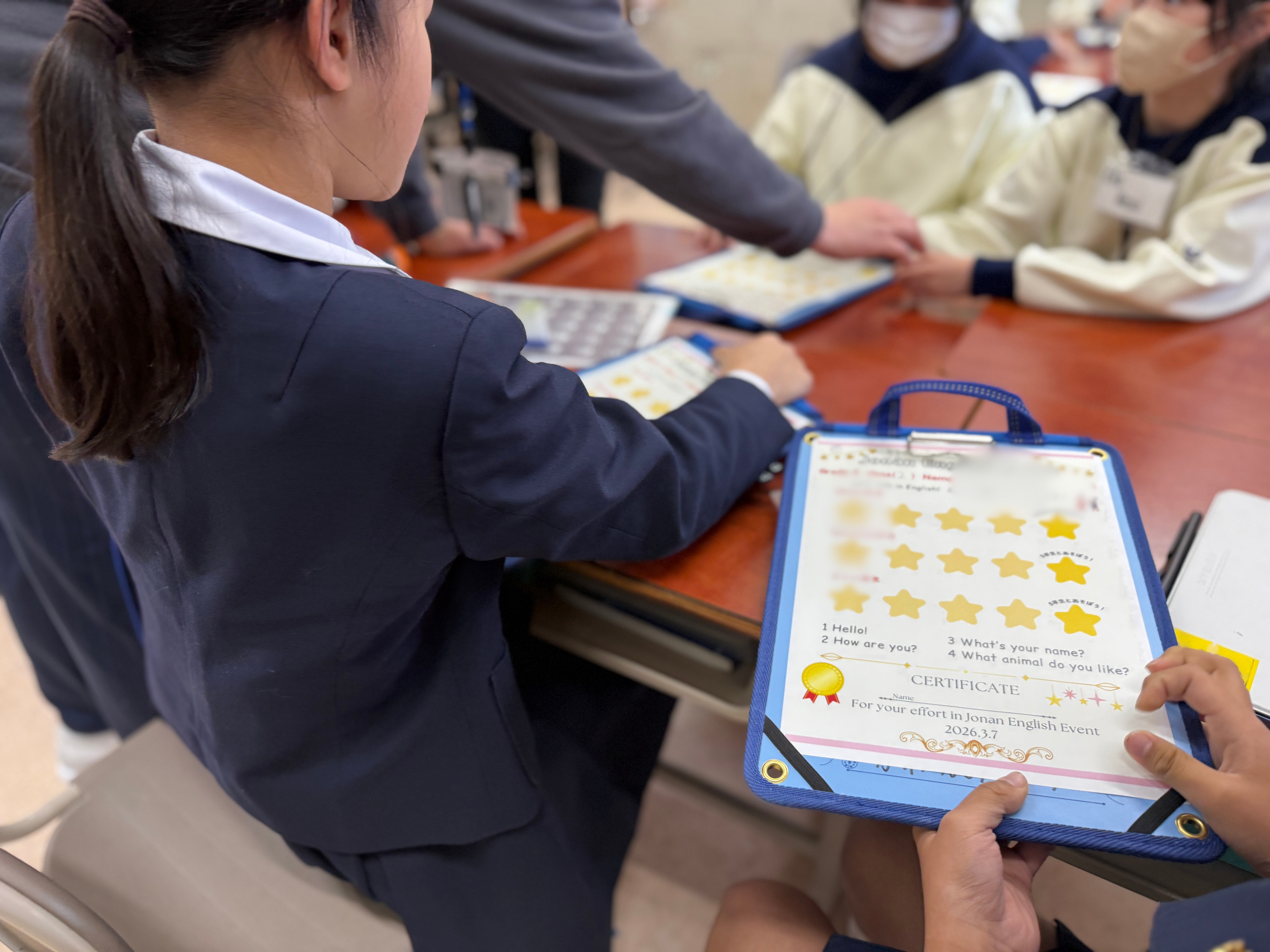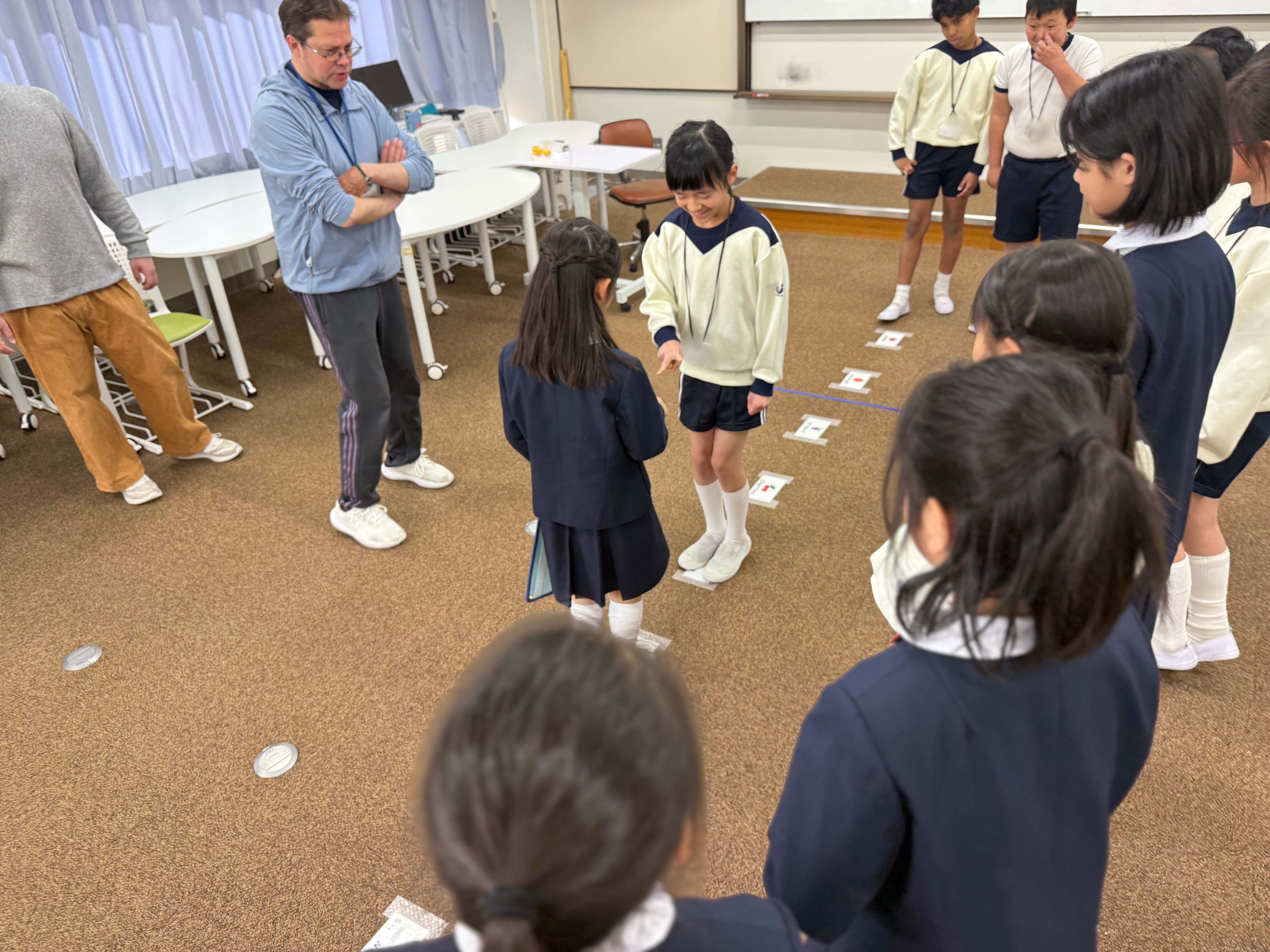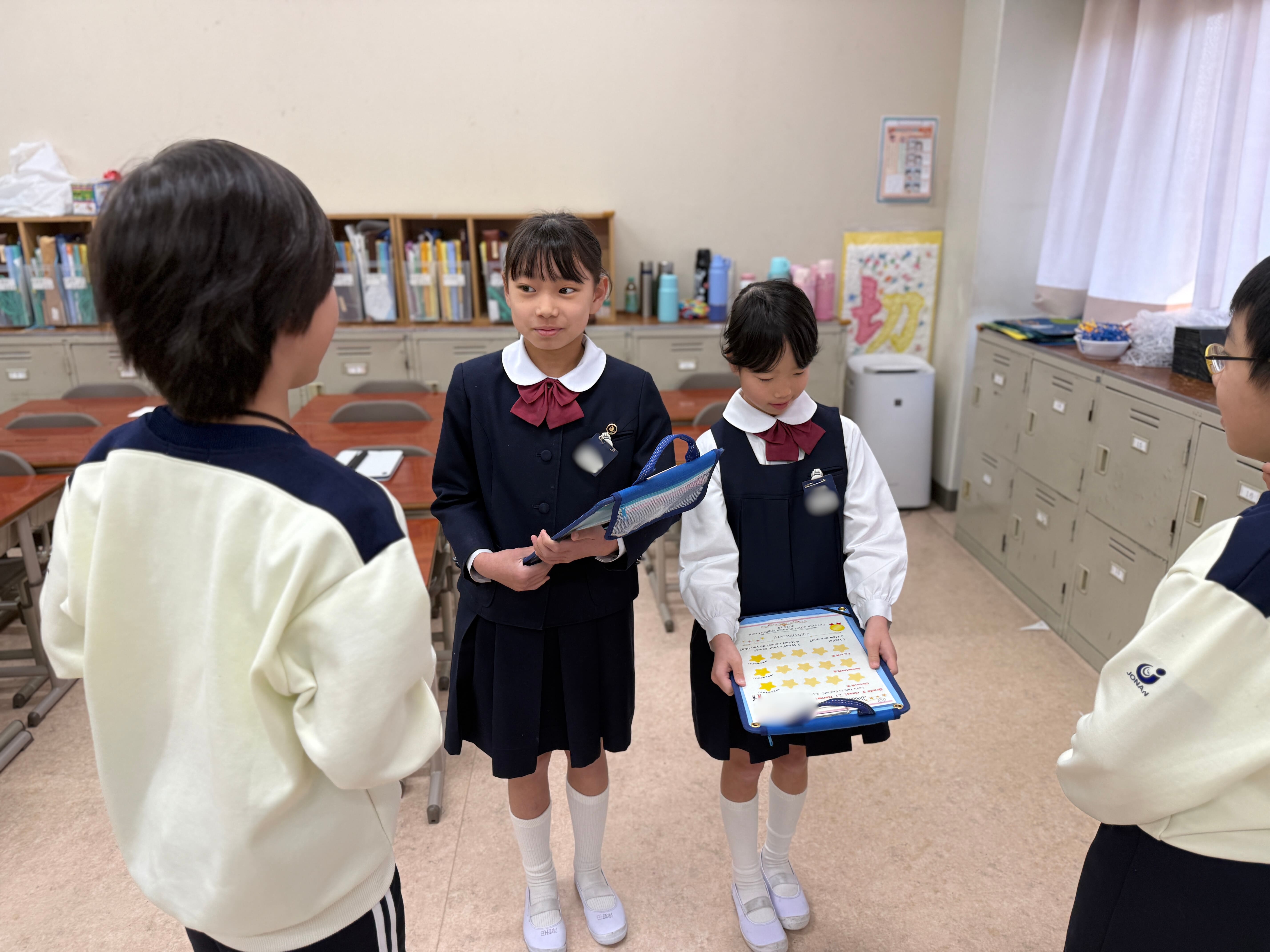 今回は、昨年秋、大阪城公園で英語の力を実践の場で力だめししてきた4・5・6年生にもお手伝いしてもらい、1年生は4年生に、2年生は6年生に、3年生は5年生に英語で質問をしたり、会話をしたり、ゲームをしたりしました。