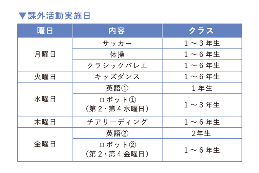 専門講師を招いて、子どもたちに人気のスポーツや英語などの7 つの課外活動を放課後に実施しています。学校内で習い事ができるので、安心・便利です。専門家の本格的な指導のもとで授業とは違う学びに触れ、子どもたちの能力、可能性を大きく広げます。