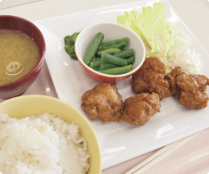 - 中学生・高校生が一緒に利用する食堂。おしゃべりをしながら楽しくお昼を食べます。
